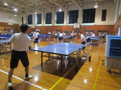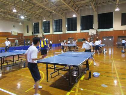 体育館のもう半面では卓球部が汗を流して一生懸命な様子です。1年生の皆さんも2年生の先輩に負けじと段々球にスピードがついてきました。練習の成果ですね。
