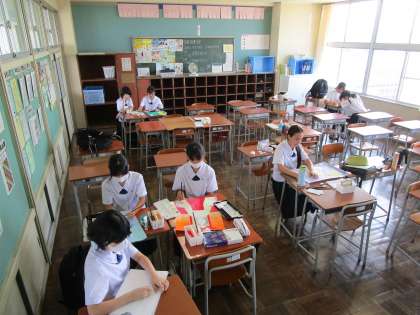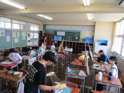 美術部は3年教室を使って作品作りです。3年生は油絵を描いている生徒も多いです。下は1年生の活動の様子です。