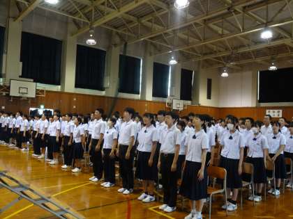 始業式では、校長が「2学期は行事が多くて長い学期だが成長するチャンスが多い。1つ1つのことに挑戦する気持ちを大切にして達成感を味わい、新しい自分、知らなかった自分に出会ってほしい」と全校生徒にエールを送りました。