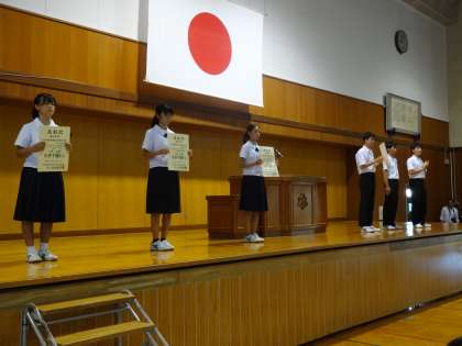 始業式後、北信越大会や県民体育大会で入賞した陸上競技部・ハンドボール部等の受賞報告が行われました。どの生徒も日頃の取組を大会で発揮できたことに満足した表情で、堂々と受賞を報告してくれました。
