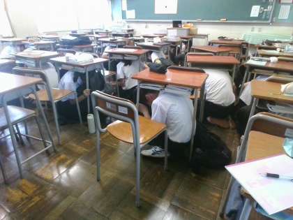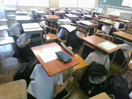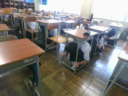生徒は机の下に入り、机の足をしっかり握って安全確保をしました。