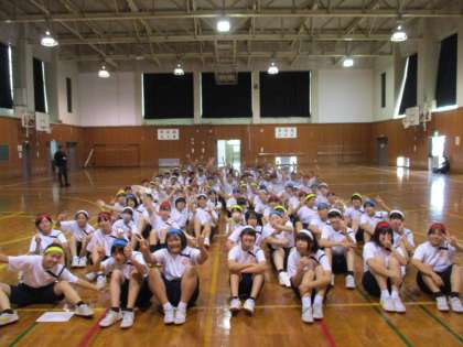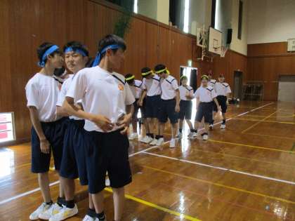 次に、変則ムカデ競走の走順に並び、実際に入場や3人4脚などを行いました。