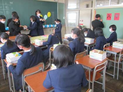 入学式に向けて その2 公開日 2020/04/07 更新日 2020/04/07 今日の興南中 4月7日(火) 5,6限 3年女子は、1年生教室で新入生のために教科書を並べました。 全部で15冊の教科書を一冊一冊確認しながら、新入生の机に並べていました。