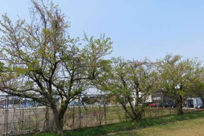 グラウンドを散歩していると、興南桜が花びらを落とし、どんどん葉桜になっていました。(写真:上)