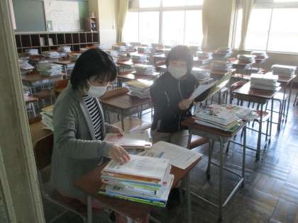 明日、明後日の「補助教材等の引き渡し」に向けて、各学年でワーク、問題集、資料集等の袋詰めを行いました。
