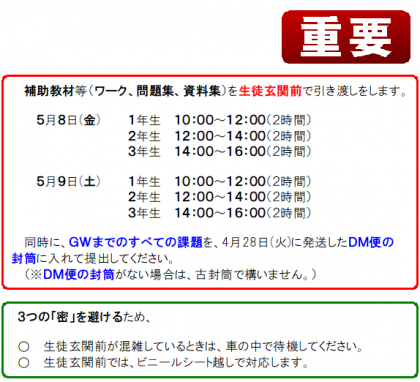 ※5月8日(金)、9日(土)、どちらも都合が悪い場合、学校に連絡してください。