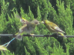 鳥の名前は「カワラヒワ」です。(写真 左側:メス、右側:オス)