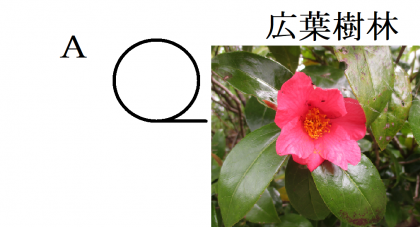 (資料 下:ツバキのように幅の広い葉をつける木が多い林です。)