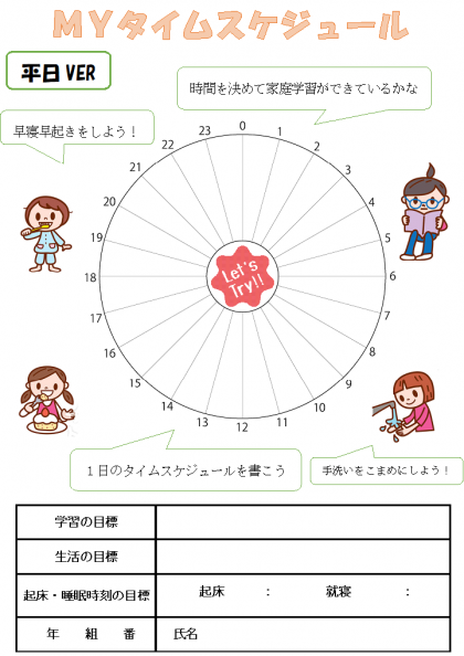 「自学時間割」に沿って、「自学ワークシート」に取り組んでもらいますが、1日のおおまかなスケジュールも立てましょう!
