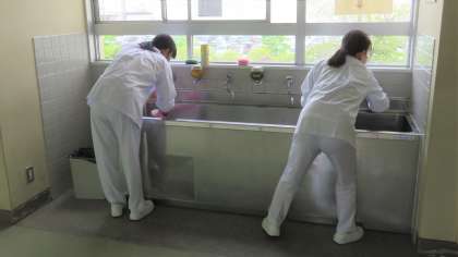 給食搬入員さん、ありがとう! その2 公開日 2020/05/19 更新日 2020/05/19 今日の興南中 5月19日(火) 11:30 給食再開に向けて、生徒のみなさんが使う廊下の洗面所を、給食搬入員さんがきれいに掃除しています。 ありがとうございます!