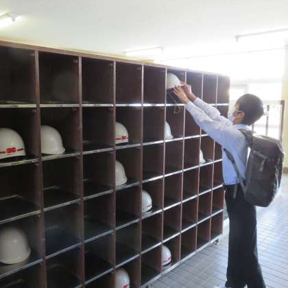 3年の自転車通学生は、その下足ロッカーにヘルメットを置くようにしました。