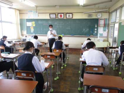 3年・授業風景 公開日 2020/05/28 更新日 2020/05/28 今日の興南中 5月28日(木) 1限 分散登校・4日目です。 ソーシャルディスタンスも慣れてきました。 (写真 上:3年1組 理科の授業) (写真 中:3年2組 英語の授業) (写真 下:3年3組 社会の授業) どのクラスも集中して話を聞いています!