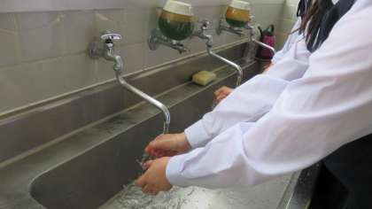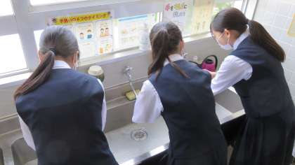昼食前の洗面所は大渋滞!! 公開日 2020/06/01 更新日 2020/06/01 今日の興南中 6月1日(月) 12:10 昼食前の手洗いは念入りに行っているので、洗面所は大渋滞です。 (写真:職員室前の洗面所も使っています。)