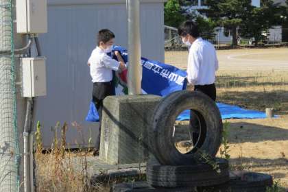 生徒会旗がたなびく! 公開日 2020/06/08 更新日 2020/06/08 今日の興南中 6月8日(月) 8:00 ようやく今日から前期生徒会が本格的に活動を始めました。 校紀実践部が旗を掲揚します。(写真:上) この旗は、昨年度末に育友会でつくっていただいた生徒会旗です。 実は、今日が初めてのお披露目です! これから、毎日、この生徒会旗が掲揚されます。 すごくかっこいいですね!!(写真:下)