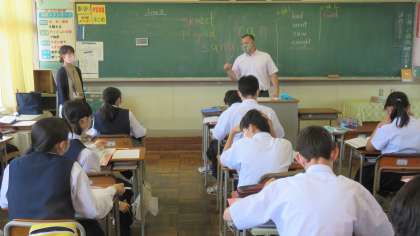 (写真 下:2年2組の英語の授業)