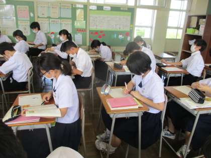 2年・授業風景 公開日 2020/06/10 更新日 2020/06/10 今日の興南中 6月10日(水) 6限 2年生は毎時間、授業に真剣に取り組んでいます。 (写真 上:2年1組 国語 問題プリントに取り組んでいます。) (写真 中:2年2組 美術 ポスター制作のために調べています。) (写真 下:2年3組 英語 構文のつくりについて学んでいます。)