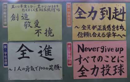 ▲中央階段の踊り場の掲示板に注目! 6月18日(木) ようやく全学年の学年目標が出揃いました。