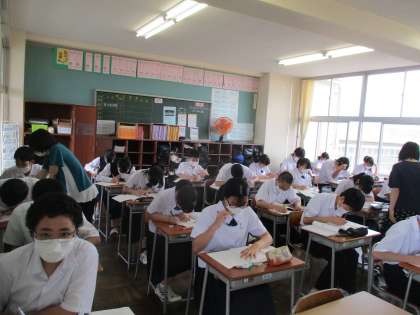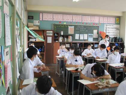 2年・授業風景 その1 公開日 2020/06/18 更新日 2020/06/18 今日の興南中 6月18日(木) 3限 (写真 上:2年1組 数学) TT(ティーム・ティーチング)で授業を進めています。 (写真 中:2年2組 英語) 構文に取り組んでいます。 (写真 下:2年3組 家庭科) 教室の各所に吹き流しを設置して、空気の流れを確かめています。