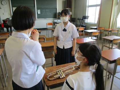 (写真 中:トランペットパート 上級生が使い方を実演)