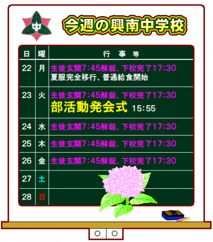 ★今週の興南中学校★ 公開日 2020/06/21 更新日 2020/06/28 お知らせ 6月21日(日) 15:00 今週から、夏服完全移行、普通給食開始になります。 明後日23日(火)は、ようやく部活動発会式を行います。 ムシムシ、ジメジメした日が続きますが、今週もがんばりましょう!