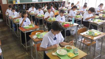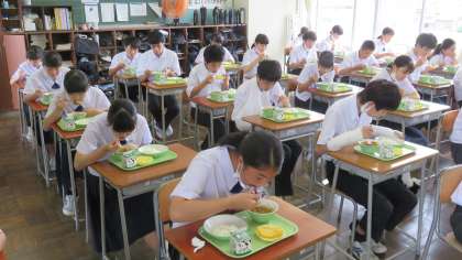 今日の給食の献立は、「ごはん・牛乳・キーマカレー・オムレツ」です。