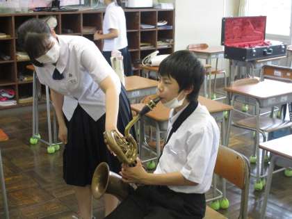 (写真 中:サクソフォンパート 先輩が姿勢を確認)