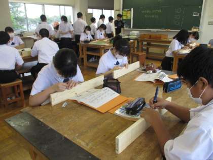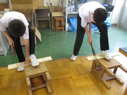 1年生の技術では、木材をのこぎりで切断して加工し、フラワーポットを作っています。