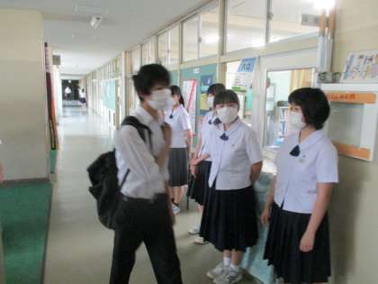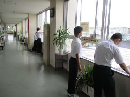 朝の週当番活動の担当である2年1組は、2階廊下の窓ガラス磨きと登校してくる生徒への声かけを行いました。