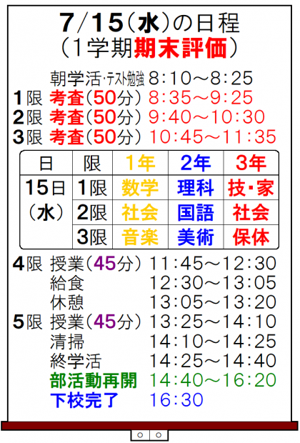 明日、期末評価・3日目です! 公開日 2020/07/14 更新日 2020/07/14 今日の興南中 7月14日(火) 18:00 明日は、期末評価・3日目(最終日)です。 (日程は、下記のとおりです。) PS 明日から、部活動が再開します。