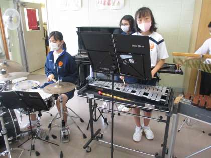(写真 中:パーカッションパート 1年生が増えてにぎやかに)