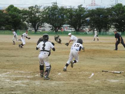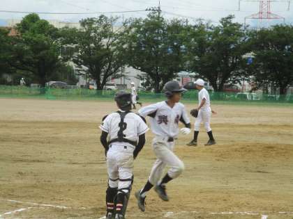 (写真 上:先取点につながる一打 下:2点目を踏むランナー)