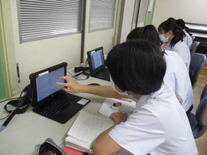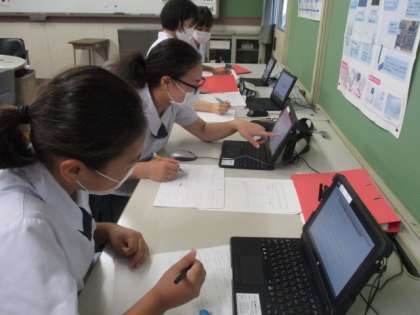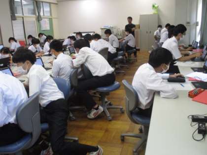 写真は3年1組の様子です。コンピュータ室で情報収集ができた人から、実際にレポートを書き始めています。