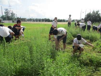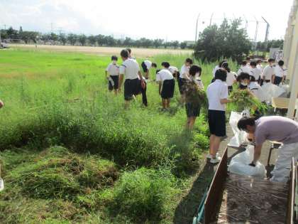 種を蒔こうとしましたが、花壇の周りに雑草がたくさん生えていたため、まず実践部部員で除草しました。