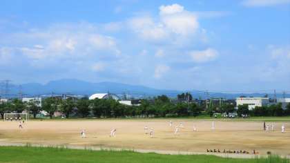 グラウンドでは、野球部、サッカー部、陸上競技部が練習しています。