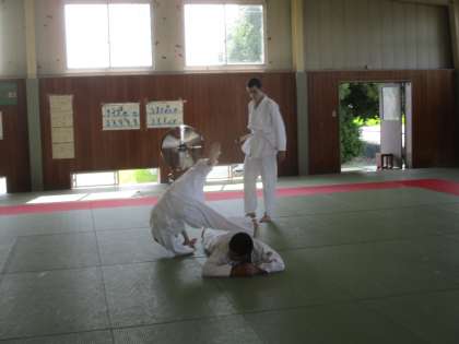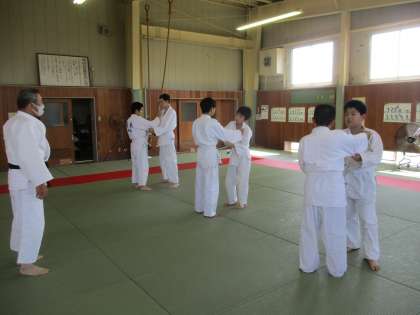 (写真 上:けが予防のために、しっかり受け身の練習を)