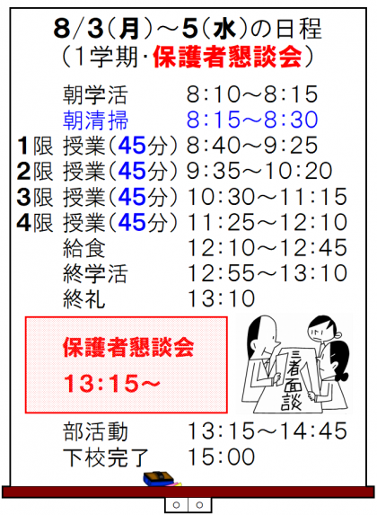 明日から「保護者懇談会」です! 公開日 2020/08/02 更新日 2020/08/02 今日の興南中 8月2日(日) 17:00 明日から3日間、保護者懇談会を行います。 (3日間の日程は、下記のとおりです。) よろしくお願いします!!