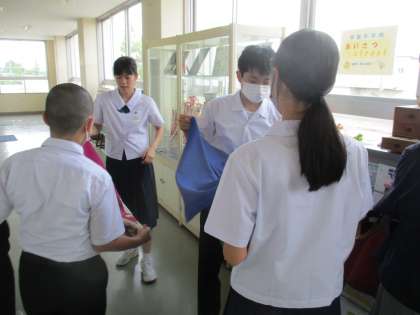 (写真:廊下で保管している場所から校旗を取り出す1年生実践部)