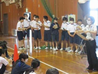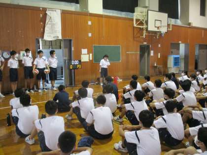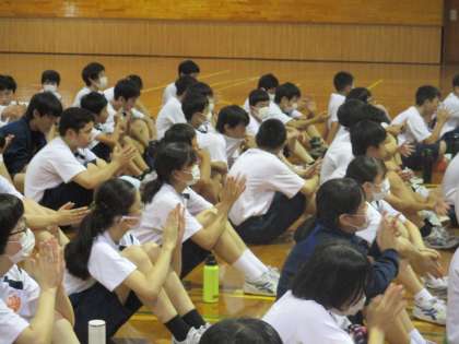 2年・スポーツ大会 その3 公開日 2020/08/04 更新日 2020/08/04 今日の興南中 8月4日(火) 1限 本日のスポーツ大会は、体育実践部の生徒が企画・運営し、計画どおりスムーズに進行することができました。 熱中症予防のため、急遽、時間帯が変更になりましたが、臨機応変に対応し準備等もしっかりと行ってくれました。 最後は、頑張ってくれた実践部員に、みんなで拍手!(写真:下)