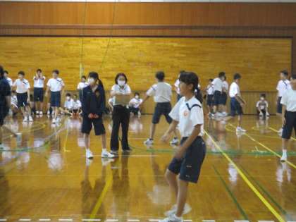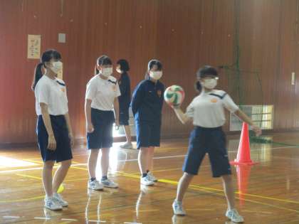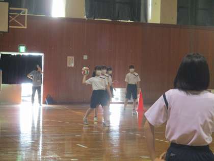 男子とは違い、おしとやかに、仲間に当たらないように配慮しながらボールを投げる女子の姿が・・・。