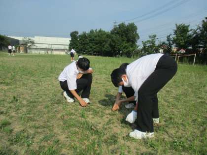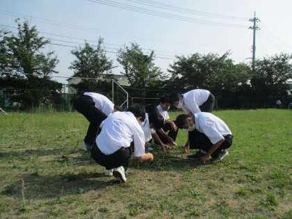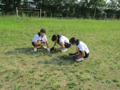 昨日に引き続き、1年3組がグラウンドの除草作業をしました。