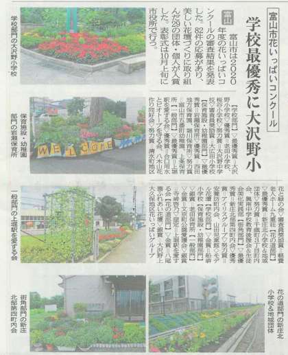 フラワーロード・努力賞! 公開日 2020/08/05 更新日 2020/08/05 今日の興南中 8月5日(水) 18:00 今年度の「富山市花いっぱいコンクール」の審査結果が発表され、本校のフラワーロードが「花の道部門」で努力賞を受賞しました。 これで、フラワーロードは、3年連続の受賞です! ▼今朝の北日本新聞(22面)