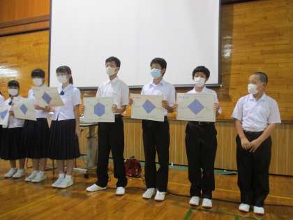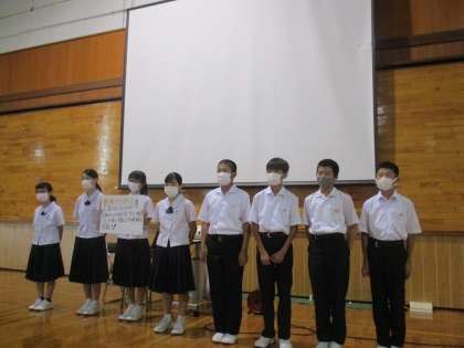 学年集会で1学期の振り返りとして、各クラスのよい点、改善点を学級代表が発表しました。