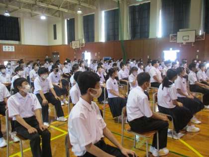 1年・学年集会 その2 公開日 2020/08/06 更新日 2020/08/06 今日の興南中 8月6日(木) 3限 各クラスの発表後、生徒指導係の森先生、学年主任の石金先生から夏休みの過ごし方について話がありました。 夏休みに入っても生活リズムを崩さず、安心、安全に過ごし、118人全員が元気な姿で2学期を始められるようにしましょう!