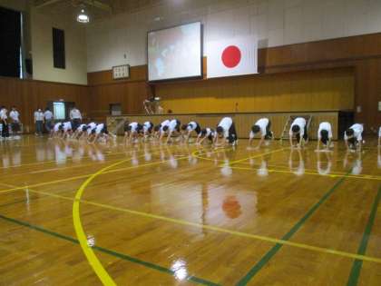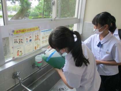1学期最後の週当番活動は、雨天のため体育館の雑巾がけ、水道の石けん交換をしました。