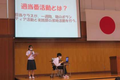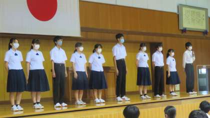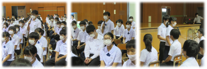 生徒会からの提案 公開日 2020/08/07 更新日 2020/08/07 今日の興南中 8月7日(金) 9:25 「1学期・終業式」が終わり、「生徒会からの提案」がありました。 (写真 上:生徒会長からの提案) (写真 中:インタビューのようす) (写真 下:各実践部長からの提案) 3年生からのメッセージに全員、真剣に耳を傾けていました!