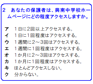 さて、今日から、1学期末(7月下旬)に実施した「興南中学校ホームページに関するアンケート」の集計結果をお知らせします。