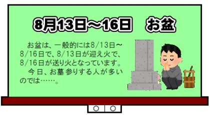 今日は、お墓参りかな? 公開日 2020/08/13 更新日 2020/08/13 今日の興南中 8月13日(木) 8:00 夏休み6日目、もう夏休み後半に入りました。 気温は28度、天気はくもり。 今日もそこそこ暑くなりそうです。 今日、お墓参りする人が多いと思います。 熱中症対策は大丈夫ですか?