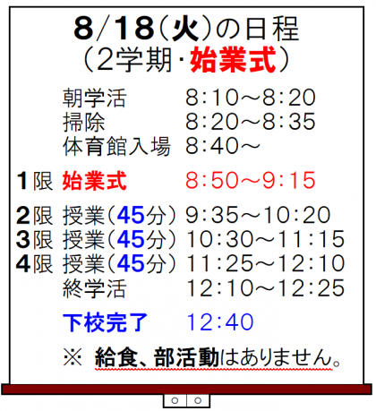明日から2学期が始まります! その2 公開日 2020/08/17 更新日 2020/08/17 今日の興南中 8月17日(月) 13:00 明日18日(火)の日程は、以下のとおりです。 給食はありません。午後放課で、部活動もありません。 よろしくお願いします!!