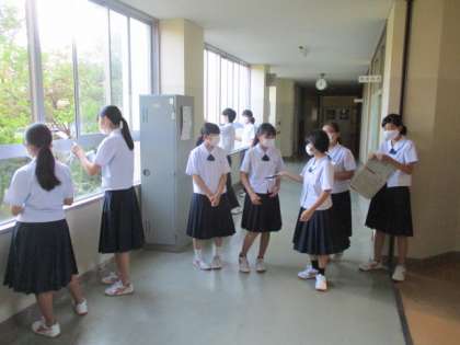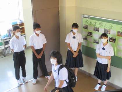 生徒玄関前と正面玄関前の挨拶運動、1階の窓ふきをしました。