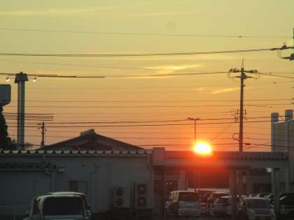 8月19日(水) 18:35 生徒が完全下校し、生徒玄関が夕陽を反射して輝いています。